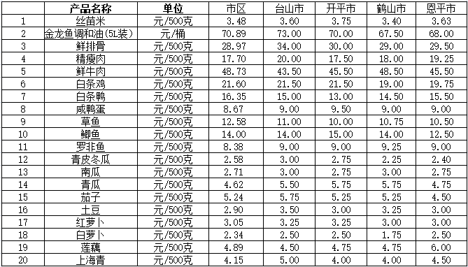说明:1、表中价格为该地区监测点综合平均价;2、“市区”含蓬江区、江海区、新会区,价格分别采自蓬江市场、江南市场、城东市场等13家农贸市场;3、其他四个县市价格分别采自新华市场、锦江市场等8家农贸市场。