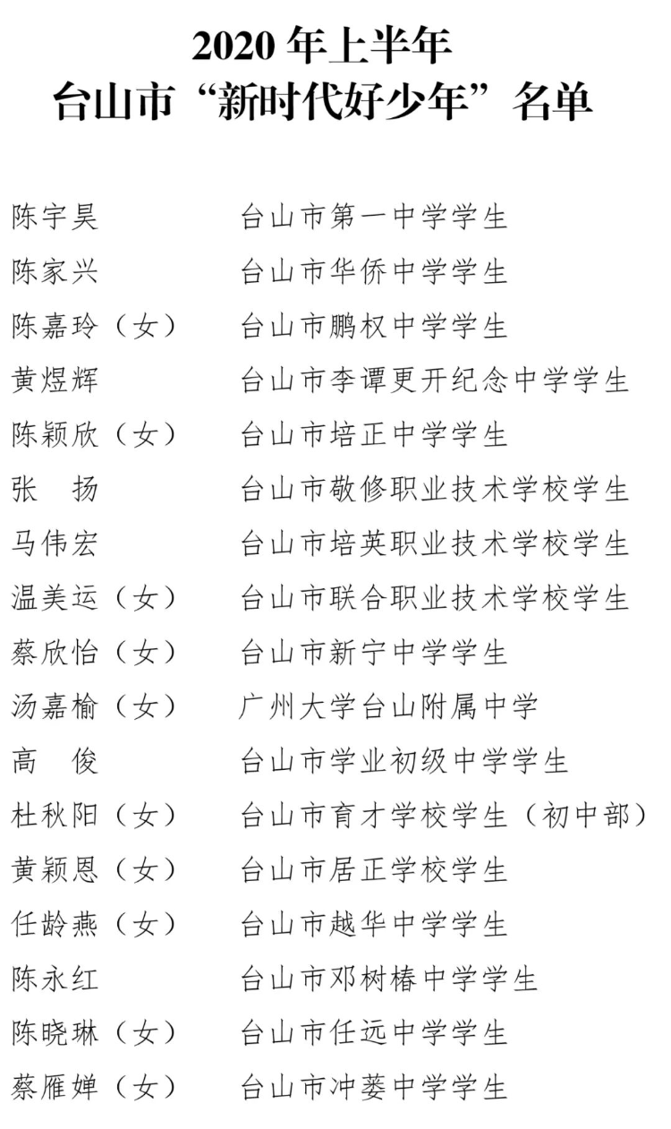 据悉,为引导广大未成年人忠于祖国、忠于人民、对标先进、向上向善、孝老爱亲,形成“人人践行核心价值观、个个争当新时代好少年”的社会氛围,今年上半年,市文明办联合市教育局、团市委、市妇联、市关工委在全市范围内组织开展2020年台山市“新时代好少年”评选活动。经各学校推荐和专家评审等程序,推选出上半年台山市“新时代好少年”60名。(通讯员:陈明凤 陈舜杰)