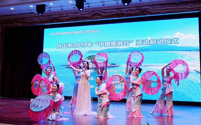 台山市2019年“中国旅游日”活动由市文广旅体局、三合镇人民政府联合主办。活动在歌舞《幸福来》中拉开帷幕,来自我市优秀的文艺工作者,用精彩的舞蹈、动听的歌曲、独具台山风情的民歌表演等形式,为到场的游客展现了台山的热情和活力。此外,结合“文旅融合”主题,主办单位还邀请我市优秀书法爱好者,即场挥毫,为在场观众送“福”。