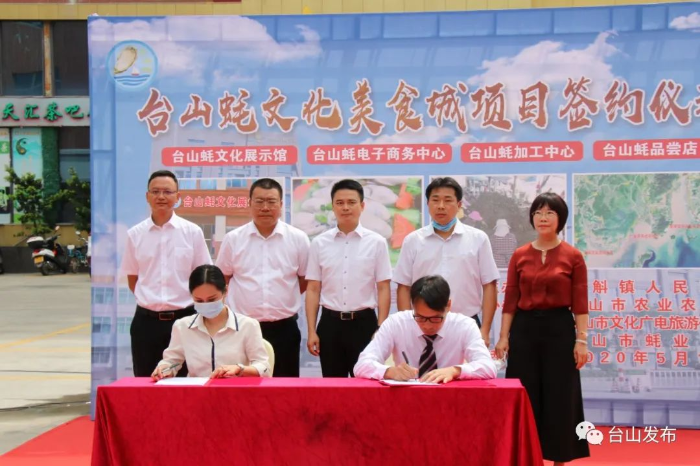 5月12日上午,台山蚝文化美食城项目签约仪式在都斛镇举行,台山市大蚝门水产专业合作社与台山市天泽贸易有限公司签订项目协议。双方将结合自身优势,整合资源全力打造台山蚝文化美食城,讲好台山蚝品牌故事,促进台山蚝产业转型升级。