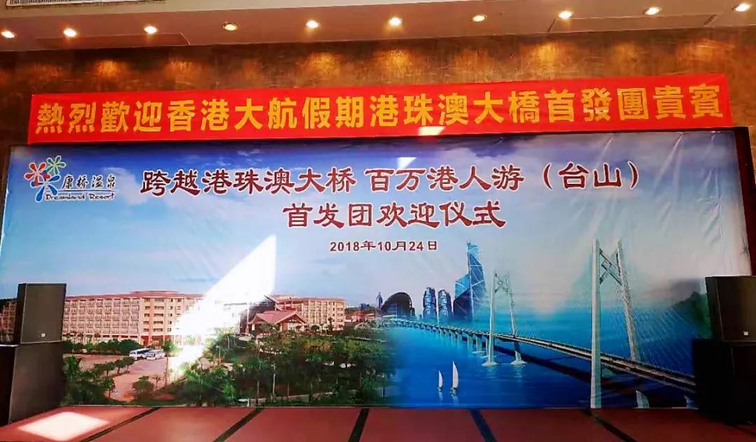 在台山市旅游局的指导下,港珠澳大桥通车首日,台山就迎来了千人香港旅游首发团,同时也举行了“跨越港珠澳大桥,百万港人游”欢迎仪式,前来台山康桥温泉度假村旅游的香港游客,在工作人员的热情接待中陆续到达。