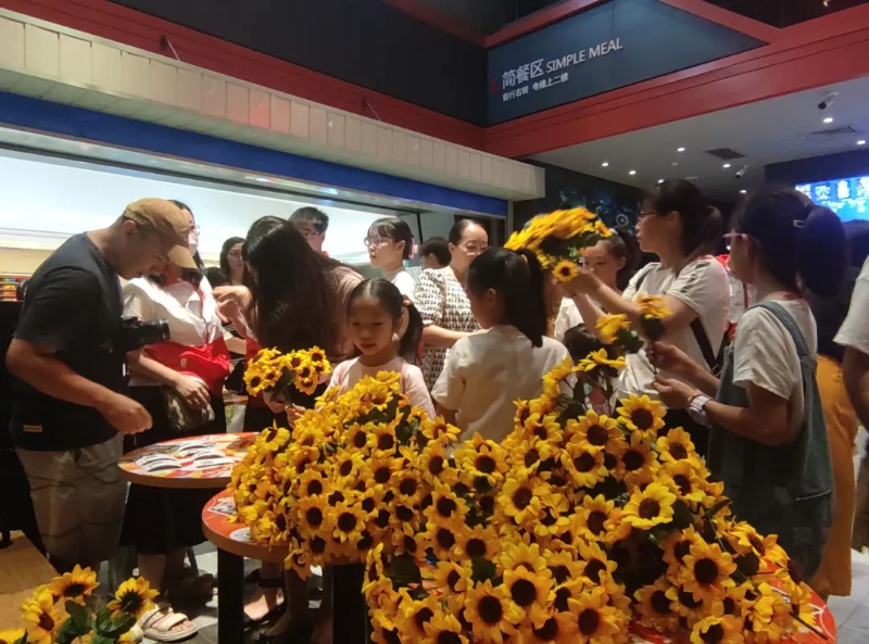 活动当晚,主办方特别为每组家庭准备了一束向日葵,象征着家庭的温馨与希望。小朋友们有序排队领取礼品,兴高采烈地与自己的爸爸妈妈拍照,期待即将开始的观影活动。