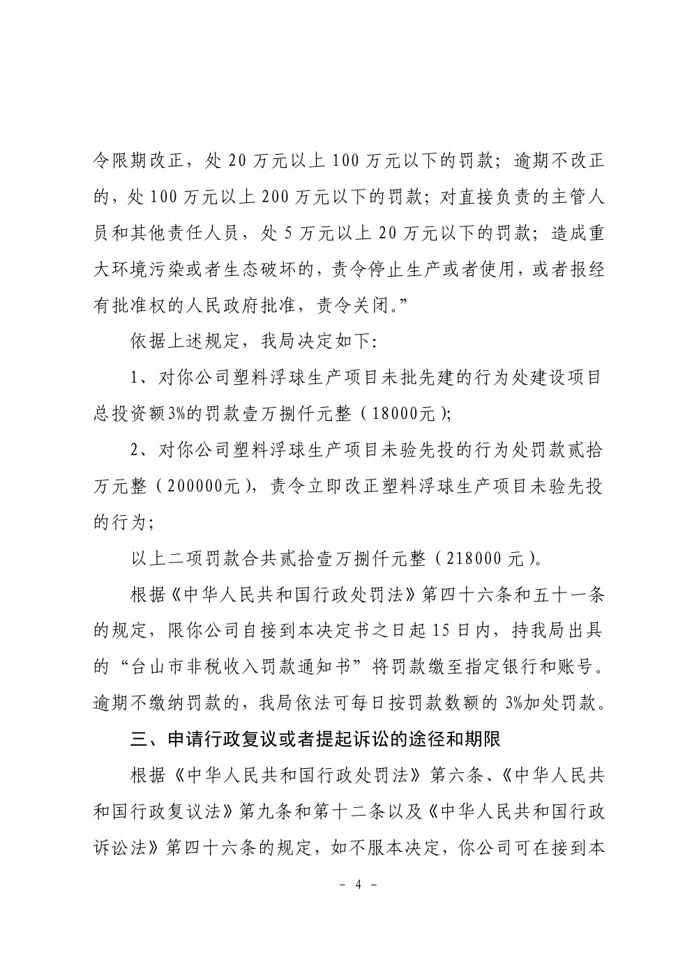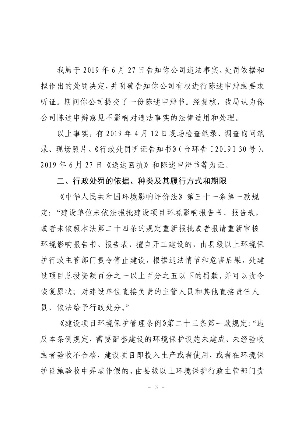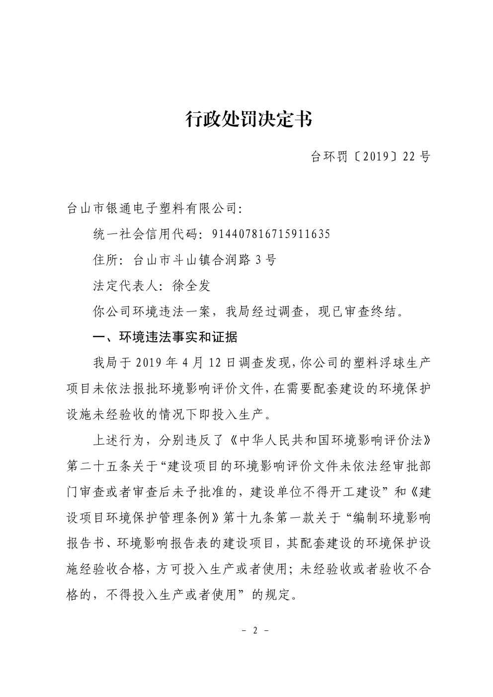 行政处罚决定书(台环罚〔2019〕22号)