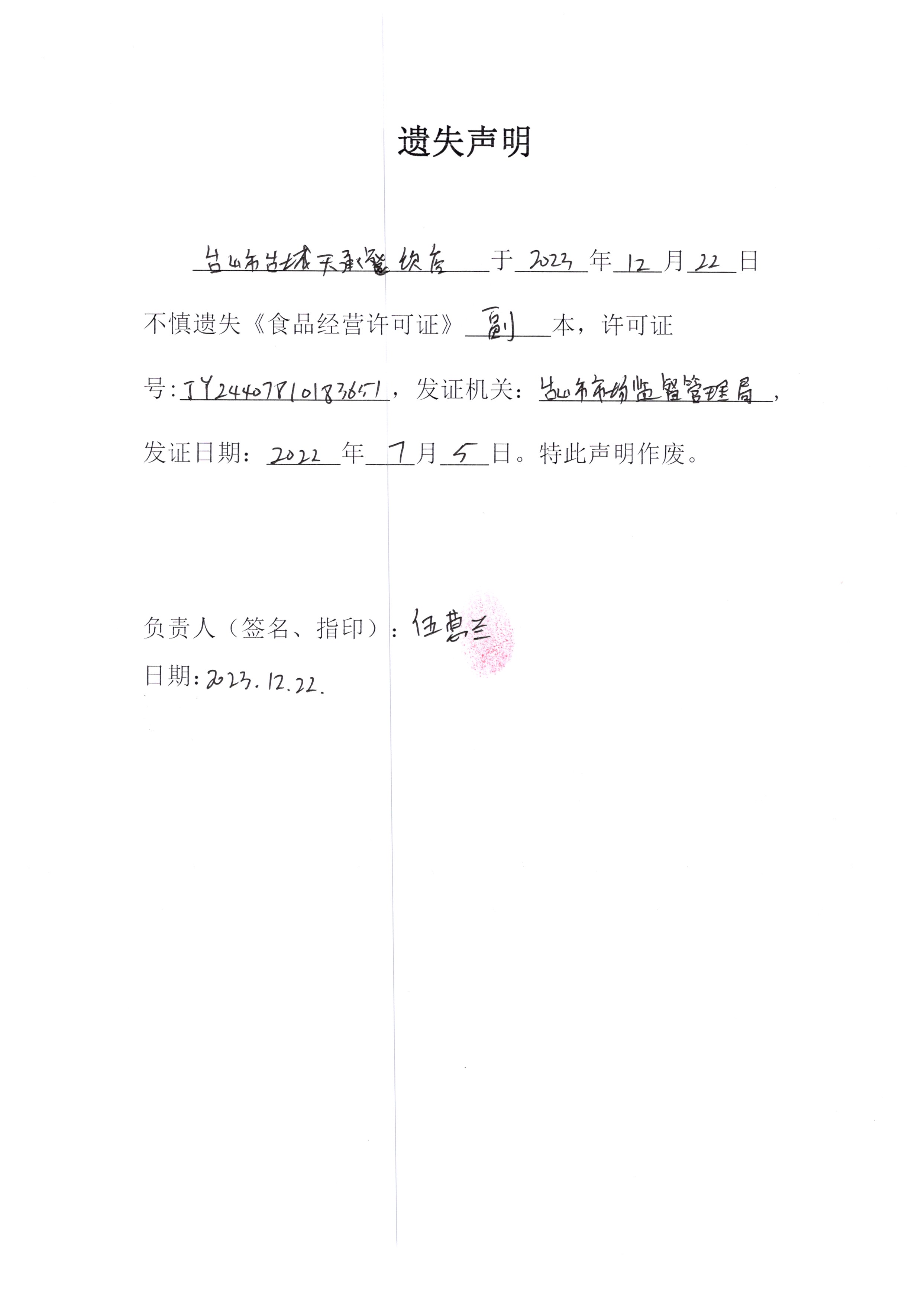 遗失声明——台山市台城天承餐饮店