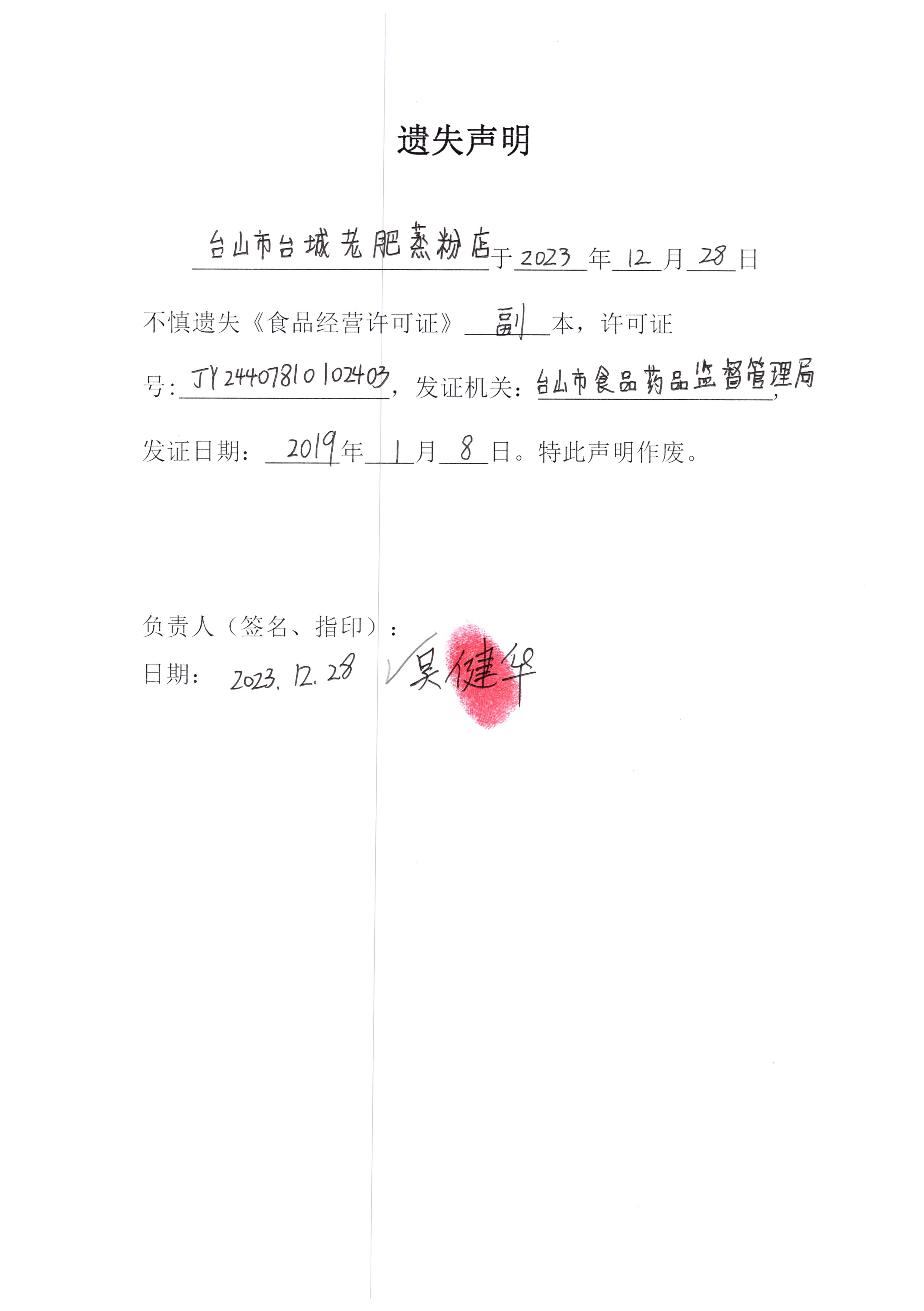 遗失声明——台山市台城老肥蒸粉店