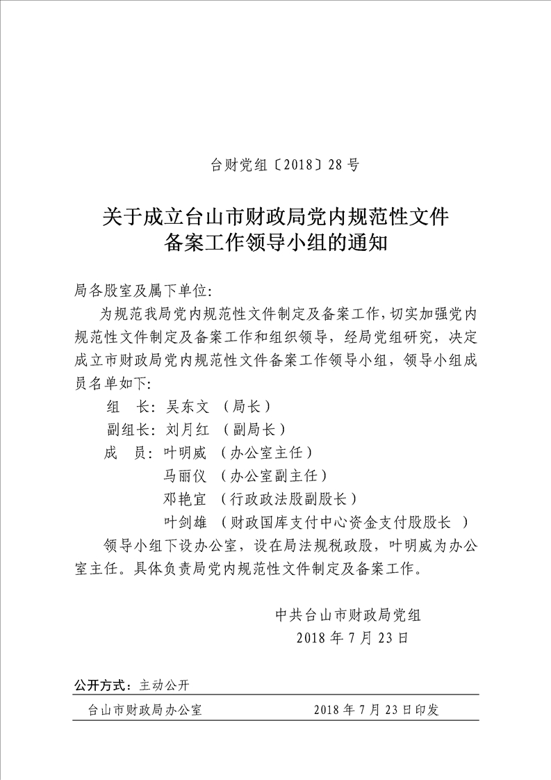 台财党组〔2018〕28号 关于成立台山市财政局党内规范性文件备案工作领导小组的通知