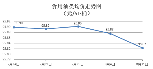 食用油类商品价格微幅下降。所监测的9种食用油(5L装)商品价格波动情况为2涨6跌1平,综合零售均价为每桶95.82元,环比下降0.06%。其中:鲁花花生油、金龙鱼调和油零售均价分别为每桶154.40元、71.23元,环比分别下降0.05%、下降0.13%。