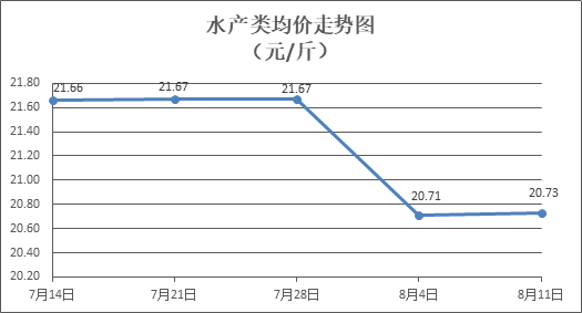 水产类商品价格窄幅盘整。所监测的10种水产商品价格波动情况为4涨5跌1平,综合均价为每斤20.73元,环比上涨0.10%。其中:草鱼、鲢鱼、鲈鱼、罗非鱼、基围虾零售均价分别为每斤11.21元、9.47元、21.49元、8.93元、29.58元,环比分别下降0.27%、上涨2.38%、下降0.69%、持平、下降0.37%。