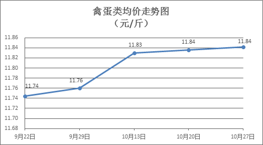 禽蛋类商品价格微幅盘整。所监测的5种禽蛋类商品价格波动情况为3涨1跌1平,综合零售均价为每斤11.84元,环比上涨0.05%。其中:白条鸡、白条鸭零售均价分别为每斤20.36元、15.36元,环比分别上涨0.05%、上涨0.26%;鸡蛋、鸭蛋零售均价分别为每斤6.52元、7.79元,环比分别下降0.46%、上涨0.13%。