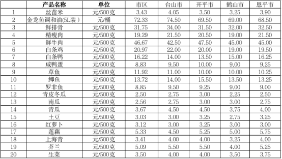 说明:1、表中价格为该地区监测点综合平均价;2、“市区”含蓬江区、江海区、新会区,价格分别采自蓬江市场、江南市场、城东市场等13家农贸市场;3、其他四个县市价格分别采自新华市场、锦江市场等8家农贸市场。