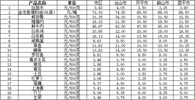 说明:1、表中价格为该地区监测点综合平均价;2、“市区”含蓬江区、江海区、新会区,价格分别采自蓬江市场、江南市场、城东市场等13家农贸市场;3、其他四个县市价格分别采自新华市场、锦江市场等8家农贸市场。
