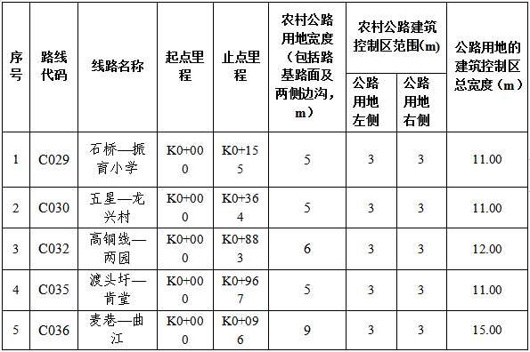 本镇管辖区内村道两侧边沟(截水沟、坡脚护坡道)外缘起一米的土地为农村公路用地。村道建筑控制区的范围是从农村公路用地外缘起向外的距离标准不少于三米,具体如下:
