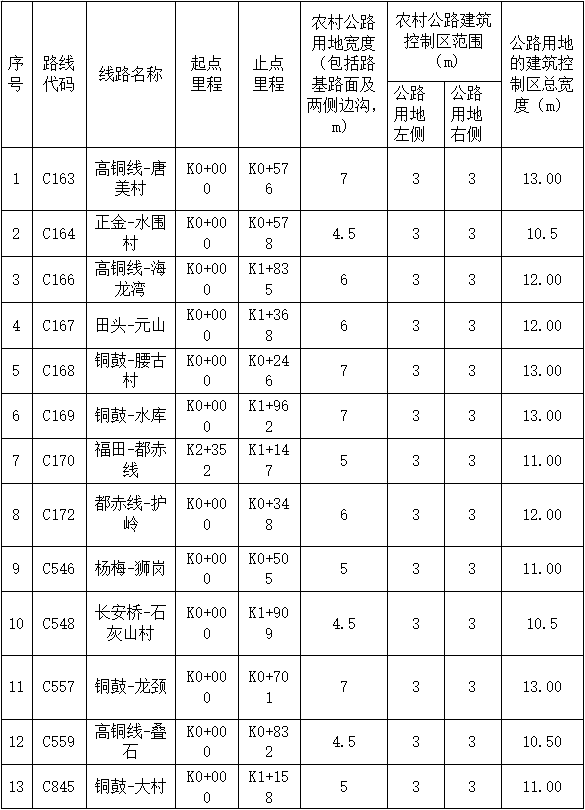 本镇管辖区内村道两侧边沟(截水沟、坡脚护坡道)外缘起一米的土地为农村公路用地。村道建筑控制区的范围是从农村公路用地外缘起向外的距离标准不少于三米,具体如下: