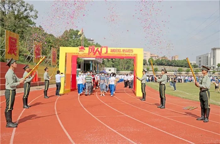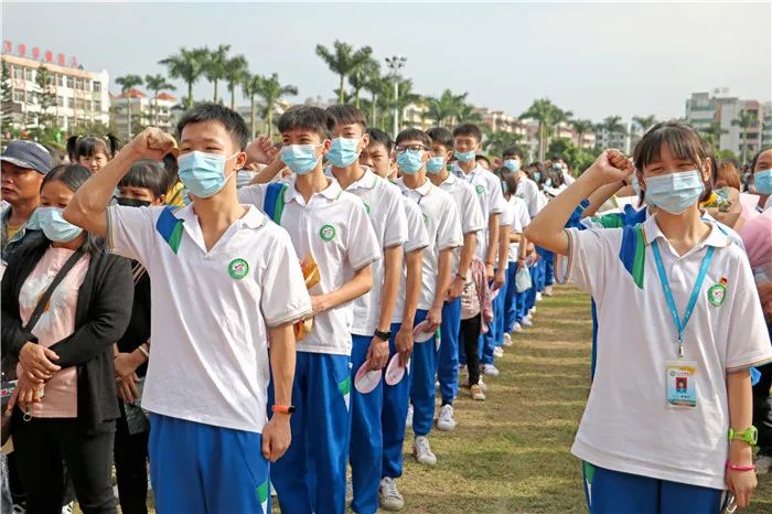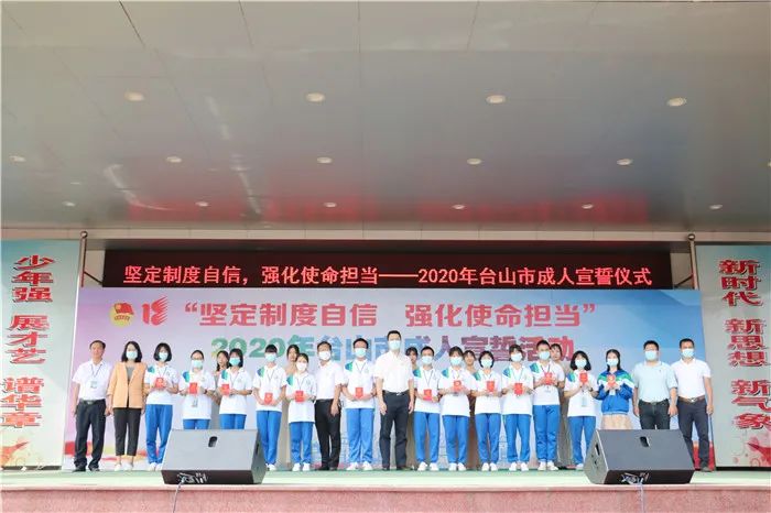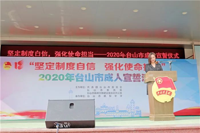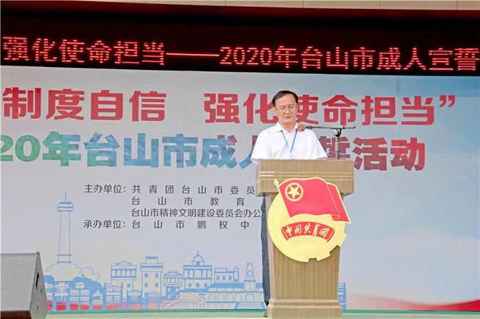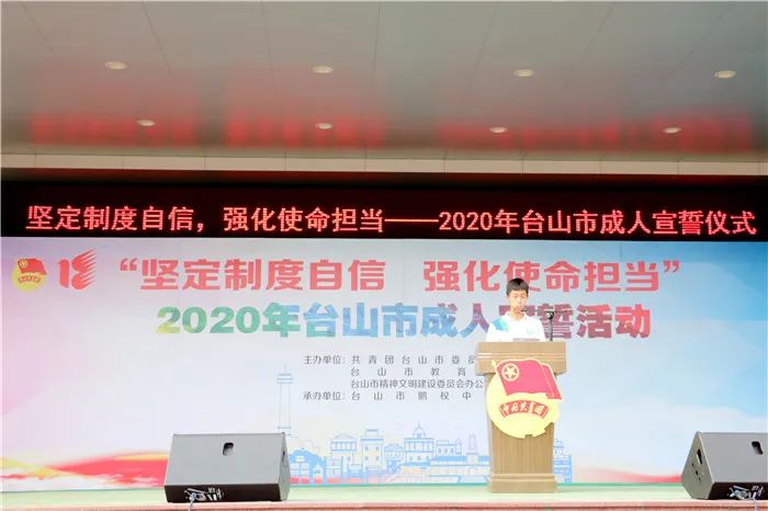 为引导广大中学生树立坚定的理想信念,培养良好的品德,进一步增强公民意识和责任意识,10月18日,团市委、市教育局、市文明办、市禁毒办在鹏权中学联合举办“坚定制度自信,强化使命担当”2020年台山市成人宣誓活动。团市委书记谢永斌、市教育局副局长李育恒、各校学生代表、家长代表以及鹏权中学全体师生共1000多人出席参加。