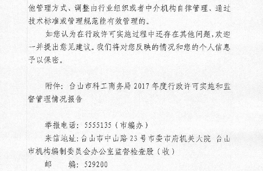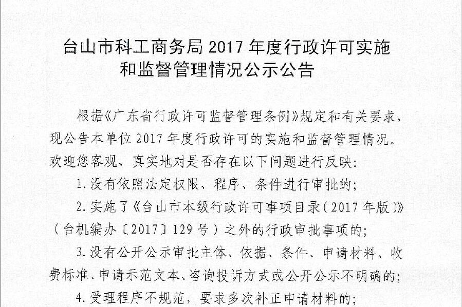 台山市科工商务局2017年度行政许可实施和监督管理情况公示公告