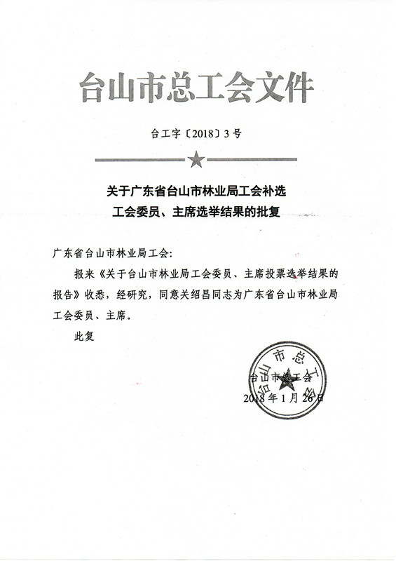 关于广东省台山市林业局工会补选工会委员、主席选举结果的批复