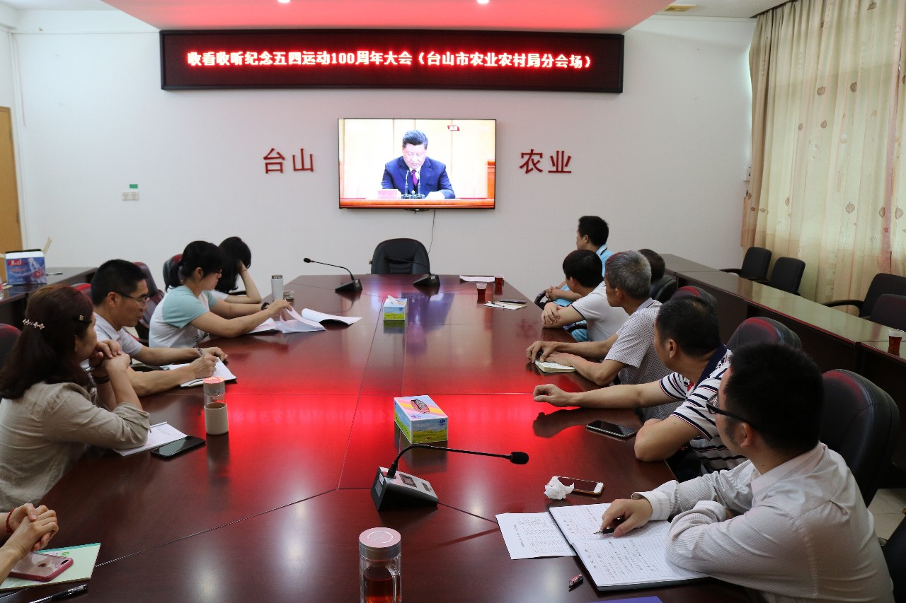 4月30日上午,市农业农村局副科级以上干部约20人在台山市分会场、各股室及直属单位负责人18人在市农业农村局分会场收看收听纪念五四运动100周年大会,中共中央总书记、国家主席、中央军委主席习近平出席大会并发表重要讲话。