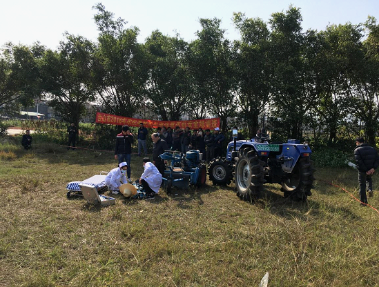 随后,在都斛镇莘村体育馆南侧场地举办农机事故应急演练暨农机安全培训。参与培训活动的有江门市农机化办及台山市农业局相关领导、台山市农业机械安全监理站全体工作人员、其他各市(区)农机监理人员、都斛卫生院医护人员、各镇农户机手等120多人。现场模拟中型拖拉机田间作业时,与手扶拖拉机发生碰撞,导致手扶拖拉机机手受伤的应急场景。演练按照我市农机安全突发事件应急预案进行,同时向现场观看人员宣讲相关法律法规知识,讲解突发事件现场处置方法,并发放安全宣传手册,进一步提高我市农机安全突发事件应对能力。