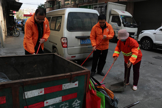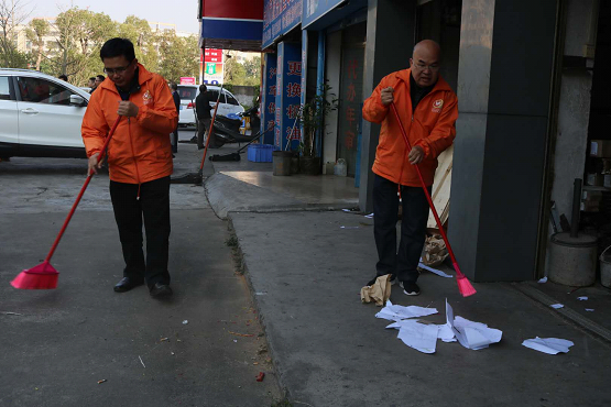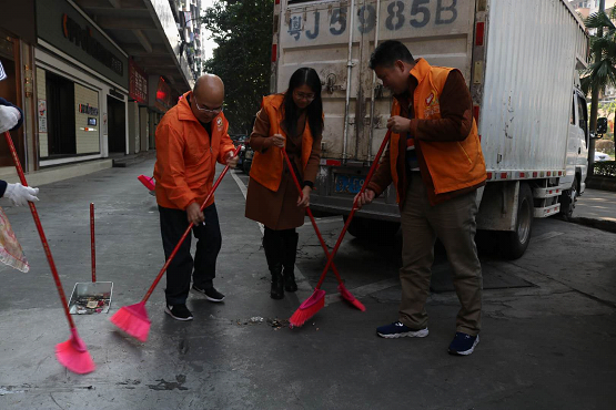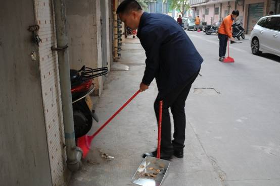 周坚校局长、李健扬副局长帮助环卫工人清理街道垃圾