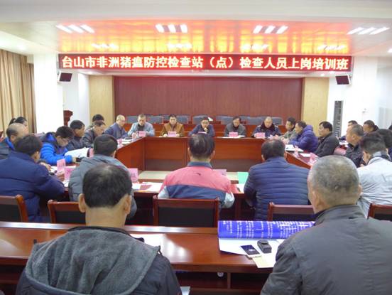 随后,市公安局、交通运输局、食品药品监督管理局和农业局按检查职责分工先后向参训人员详细讲解了检查程序和要求。此外,农业局还印制了《台山市非洲猪瘟防控临时检查站(点)日志》、《台山市非洲猪瘟防控临时检查站(点)工作流程和职责分工》挂图和工作手册派发给各镇(街)。通过此次培训,进一步明确了各单位各部门的职责分工和工作流程,提高了参训人员的业务水平。