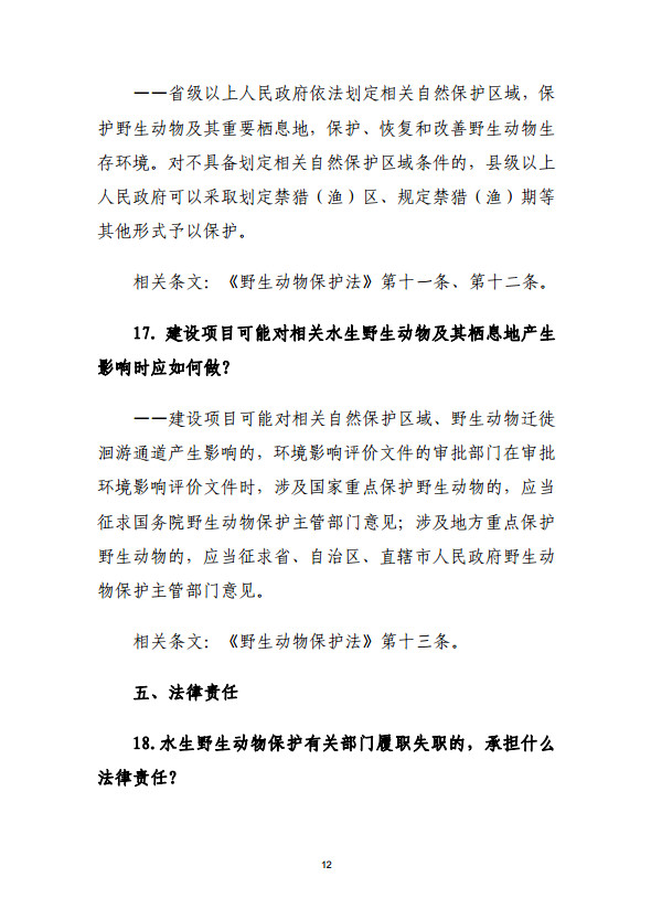 据介绍,本次普法宣传问答共23项问题,分为5个板块,从《中华人民共和国野生动物保护法》立法背景和基本情况、水生野生动物的范围、部门职责分工、野生动物及栖息地管理和相关法律责任等角度对野生动物保护法律法规进行全面解读。