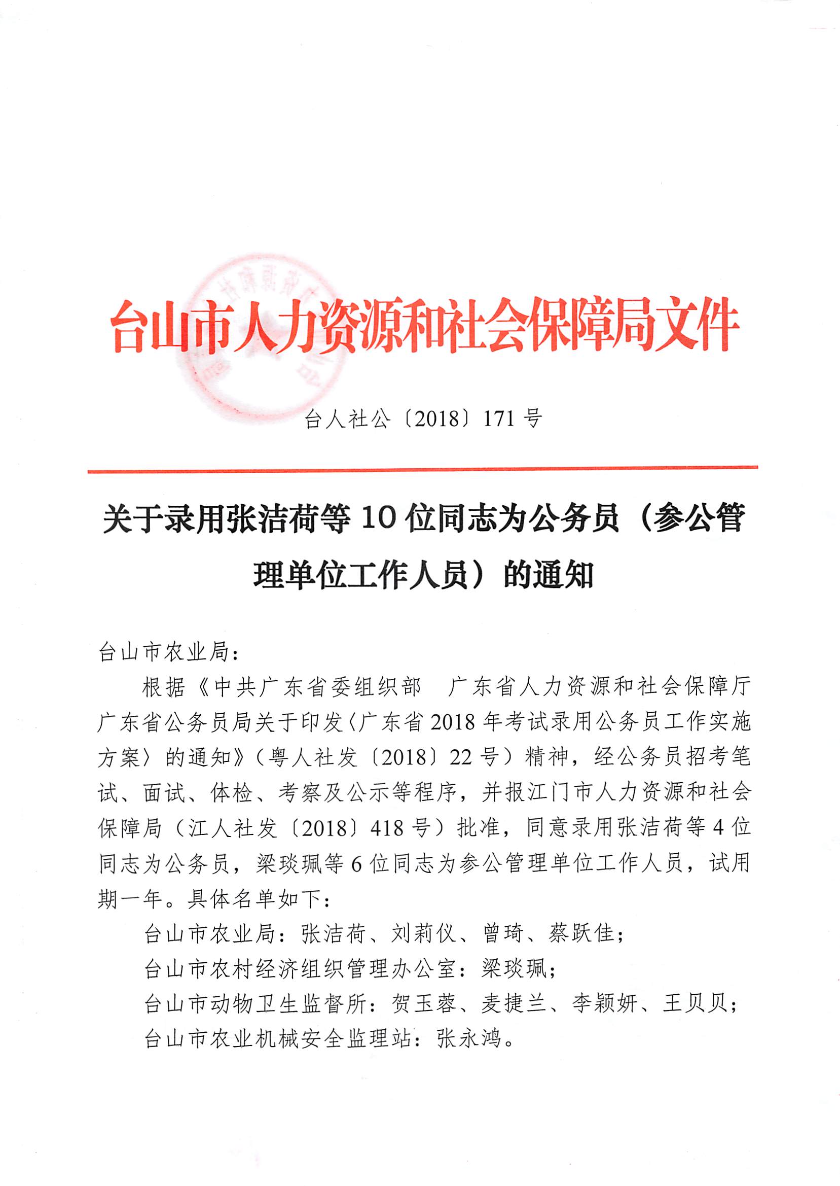 关于录用张洁荷等10位同志为公务员(参公管理单位工作人员)的通知