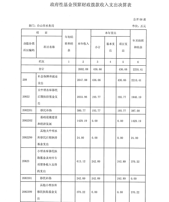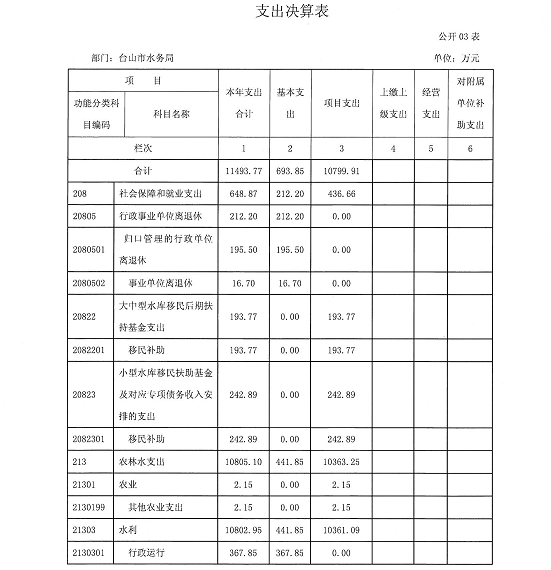 台山市水务局2015年度财政拨款支出合计 11493.77万元。其中:一般公共预算财政拨款支出 11057.1 万元,比年初预算数增加3930.12万元,增长55.14 %;主要原因是农林水项目增加;政府性基金预算财政拨款支出436.66万元,比年初预算数增加336.66 万元,增长336.66 %;主要原因是移民补助与基础设施建设增加。