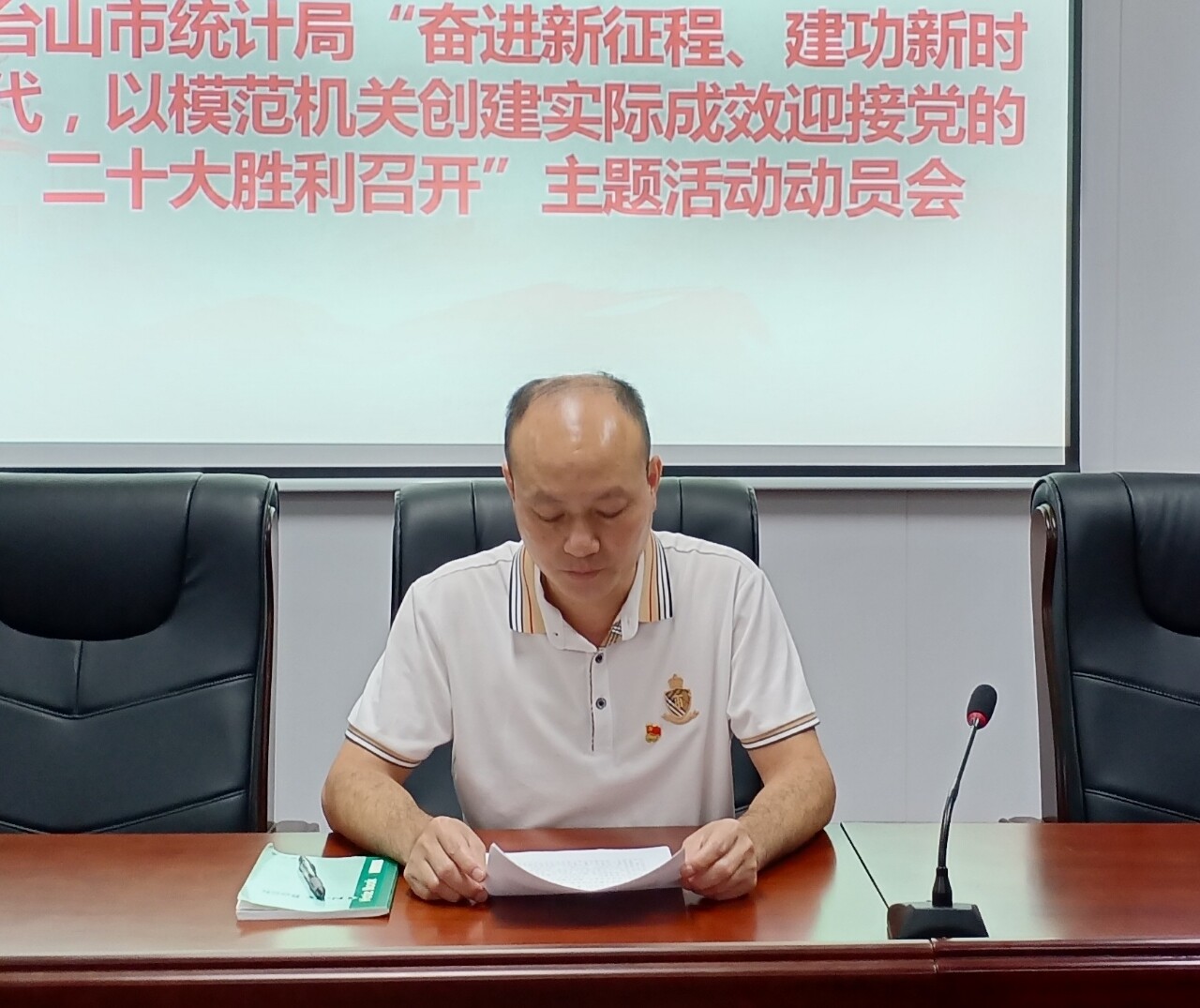 会议强调,主题动员会是在喜迎党的二十大胜利召开的重要时刻,深入学习贯彻习近平总书记关于机关党建的重要论述,认真贯彻落实省委、江门市委和台山市委部署要求,对模范机关建设工作进行再动员、再部署、再深化的一次重要会议。全体党员干部要以高度的政治责任感和使命感,全身心投入主题活动,示范带动统计系统讲政治、守纪律、负责任、有效率,把模范机关创建成效体现在推动统计事业高质量发展上,以实际行动为党的二十大召开营造良好氛围。