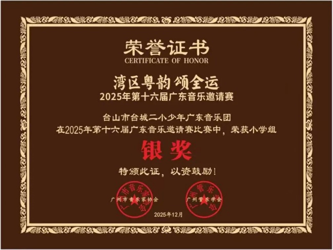 台山广东音乐团在“湾区粤韵颂全运”2025年第十六届广东音乐邀请赛中再获佳绩,荣获多个大奖及金奖证书。“湾区粤韵颂全运”2025年第十六届广东音乐邀请赛于月前在广东文艺职业学院(番禺校区)成功举办。本次赛事在广州市文学艺术界联合会、广东省音乐家协会的指导下,由广州市音乐家协会、广州管乐学会联合主办,广东文艺职业学院、广州大学音乐舞蹈学院、广州市音乐家协会广东音乐艺术委员会共同承办,我市4支队伍参加该项比赛,获得2金1银1铜的好成绩。