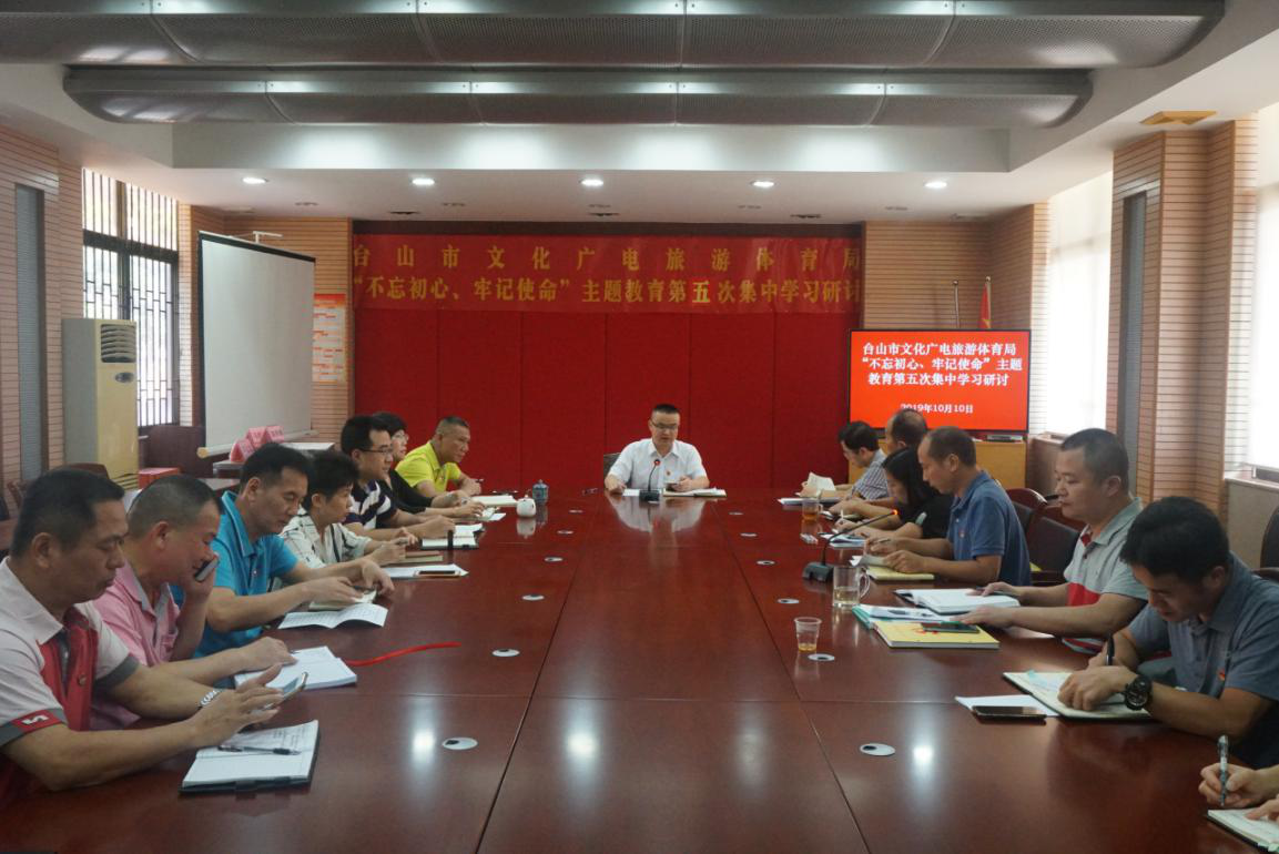 10月10日下午,市文化广电旅游体育局召开“不忘初心、牢记使命”主题教育第五次集中学习研讨会议,局党组成员、各股(室)和下属事业单位负责人参会。局党组书记、局长雷克同志主持会议,局党组成员、副局长陈伟锋同志围绕《习近平新时代中国特色社会主义思想学习纲要》《坚决彻底反对形式主义、官僚主义》等学习内容作主题发言,谭永恒股长、许洁英股长、台山排球运动学校校长李惠豹等同志分别作交流发言。