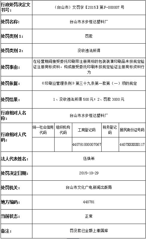 台山市水步恒达塑料厂未按规定验证注册商标资料案