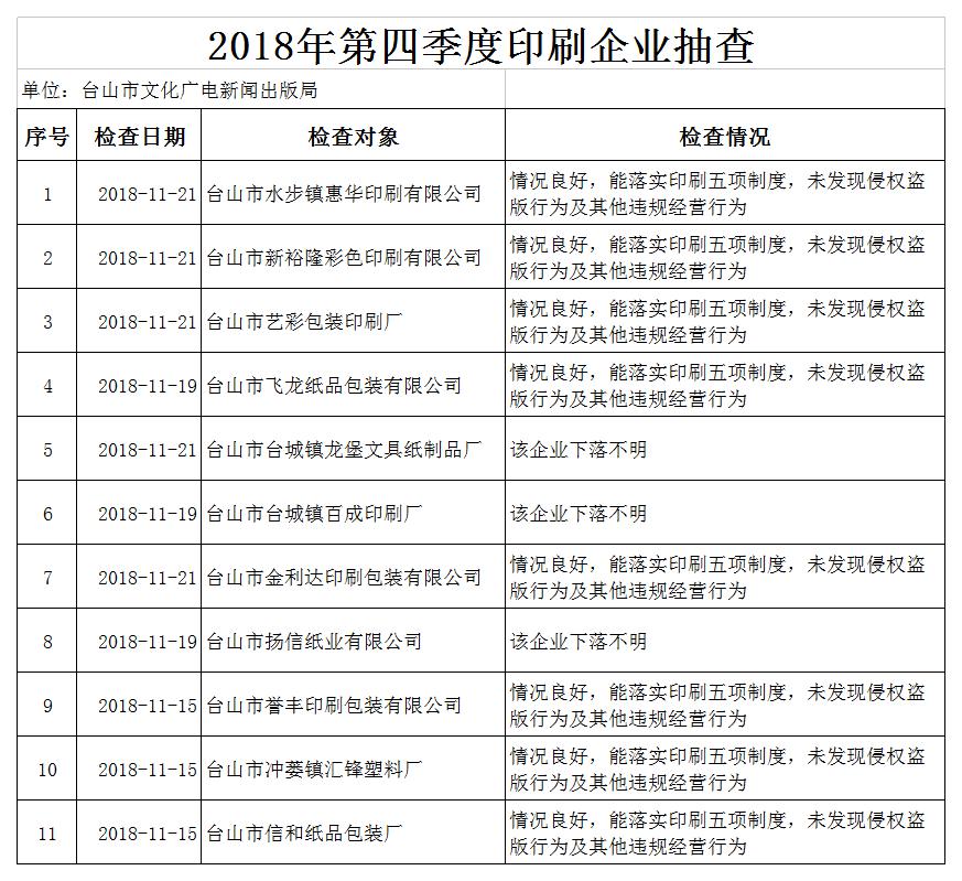 【双随机抽查情况】2018年第四季度印刷企业抽查