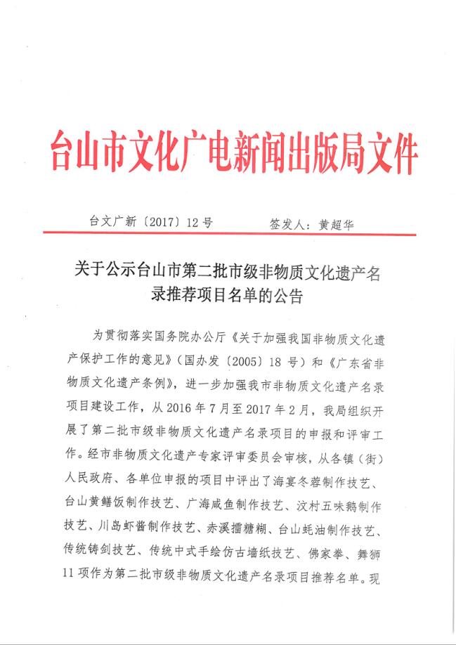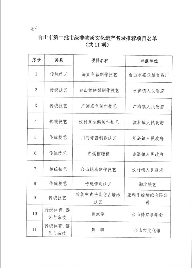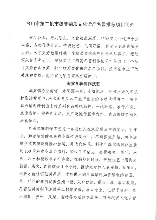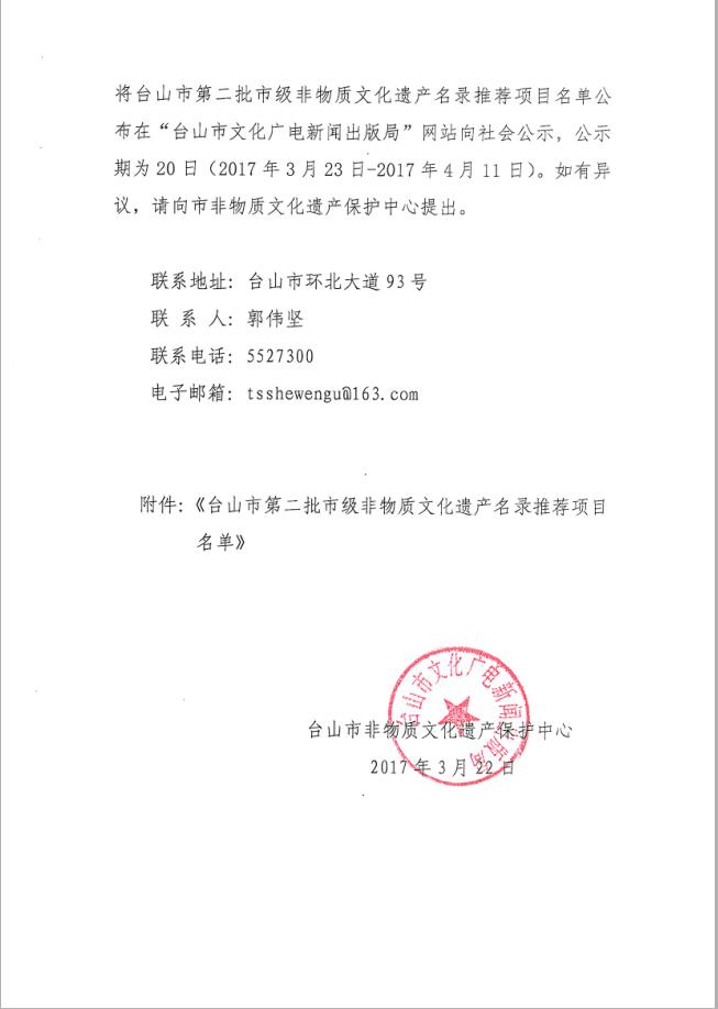 关于公示台山市第二批非物质文化遗产名录推荐项目名单的公告