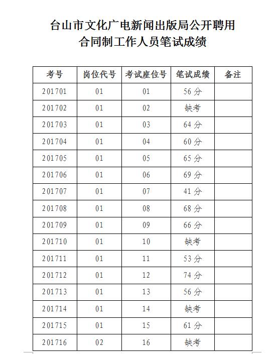 根据《台山市文化广电新闻出版局公开聘用合同制工作人员的公告》,今年我局面向社会聘用合同制工作人员3名,经现场报名、资格审核等程序,符合资格条件23人。10月19日上午已完成本次公开聘用合同制工作人员笔试,现将笔试成绩予以公布。