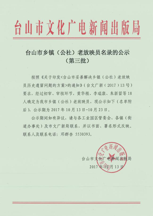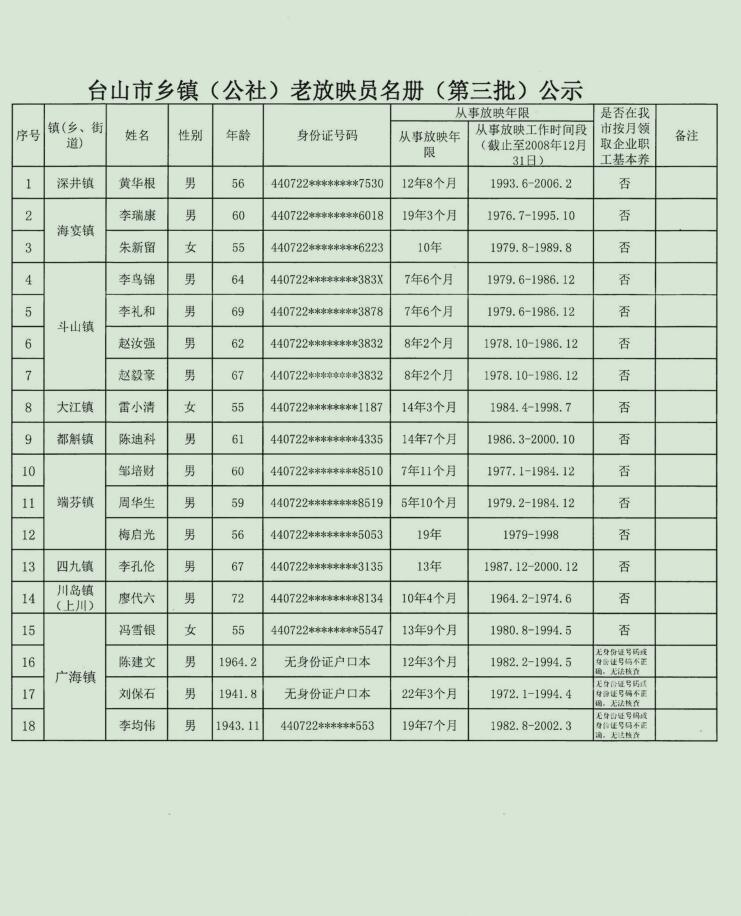 台山市乡镇(公社)老放映员名录的公示(第三批)