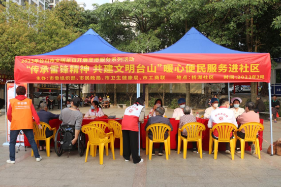为深入学习宣传贯彻党的二十大精神,贯彻落实习近平总书记关于学雷锋志愿服务系列重要指示批示精神,推动卫生健康系统学雷锋志愿服务深入开展,展示卫健风采,3月15日,市委组织部联合市民政局、市卫生健康局、市工商联在桥湖社区开展“传承雷锋精神 共建文明台山”暖心便民的义诊服务。