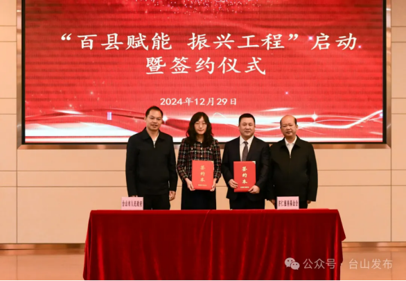 12月29日,“百县赋能振兴工程”台山市启动暨签约仪式在台山市卫生健康局举行。“百县赋能振兴工程”办公室主任汪辉,“百县赋能振兴工程”办公室常务副主任陈顺俊,台山市委书记郑劲龙,台山市政府副市长灵君出席活动。