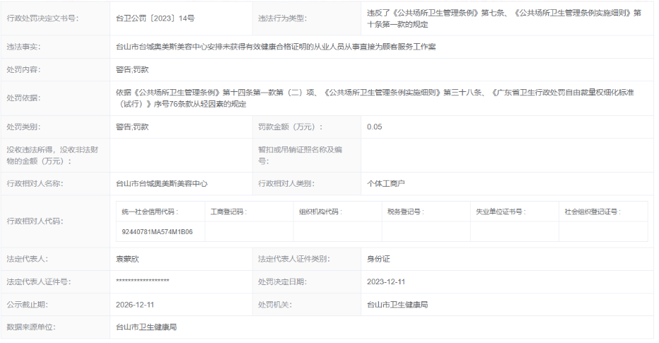 行政处罚信息详情(台山市台城奥美斯美容中心)