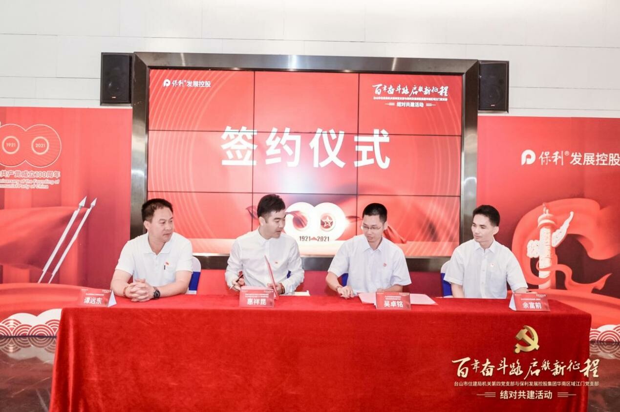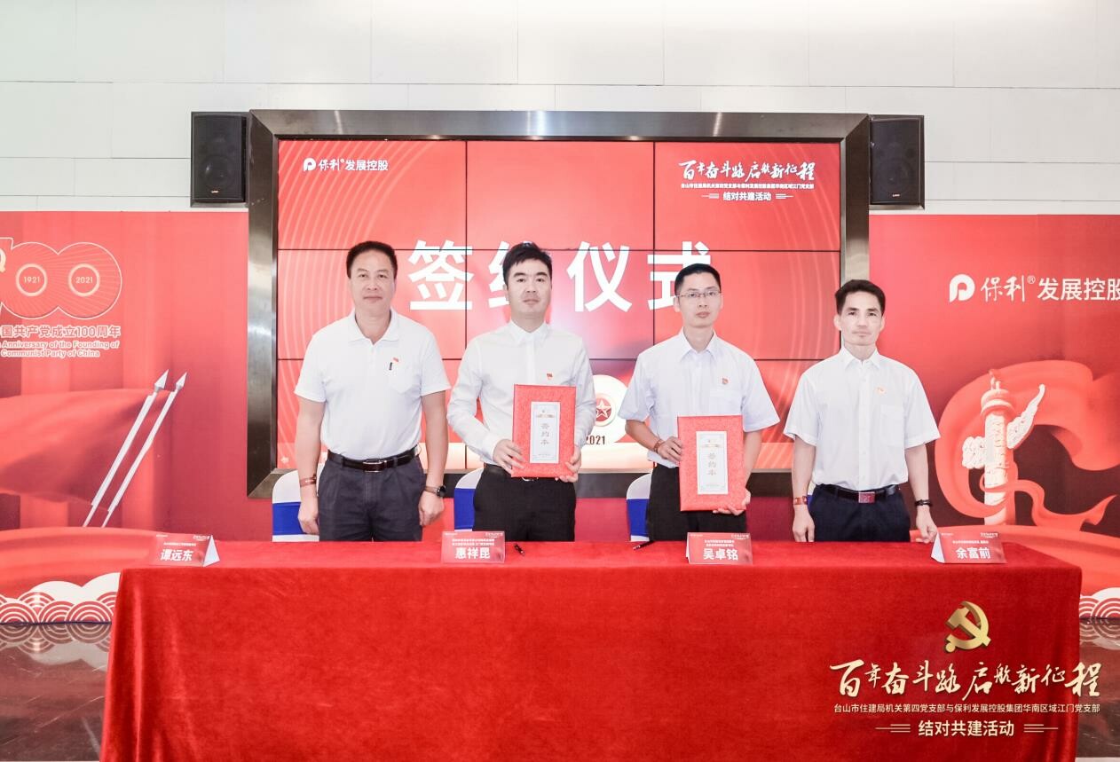 双方经友好协商,中共台山市住建局机关第四党支部和中共保利发展控股集团股份有限公司华南区域江门党支部结对为党建共建单位,并就双方今后的党建共建活动达成协议。在市直机关工委书记谭远东和市住建局党组成员、副局长余富前的见证下,中共台山市住建局机关第四党支部书记吴卓铭和中共保利发展控股集团股份有限公司华南区域江门党支部书记惠祥昆上台签署了结对共建协议书。