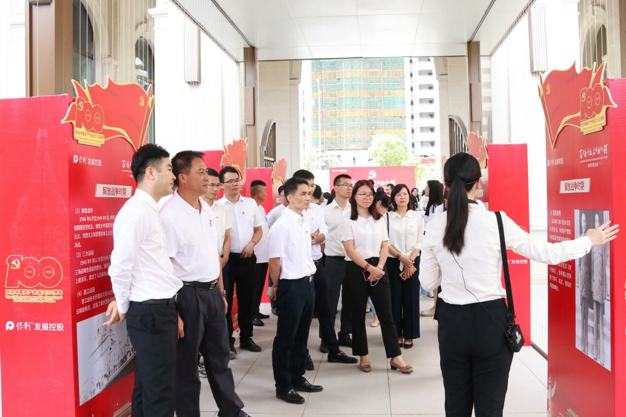 签约仪式结束后,活动人员来到红色百年党史长廊和台山市发展长廊进行现场党课学习,在讲解员的讲解下,一同领略和学习了1921到2021这100年来中国共产党波澜壮阔而又艰难曲折的奋斗历程以及台山经济社会发展的历史。