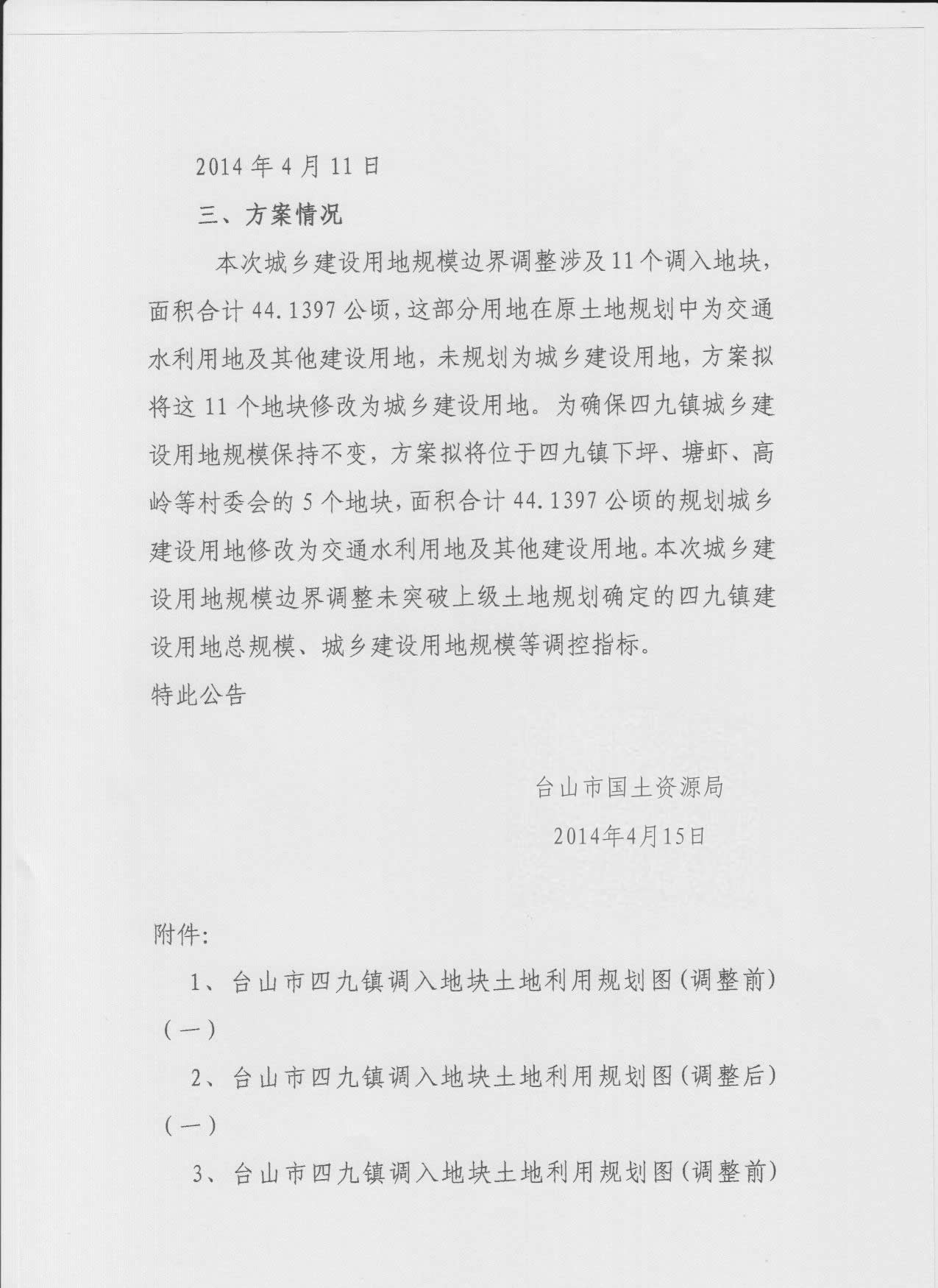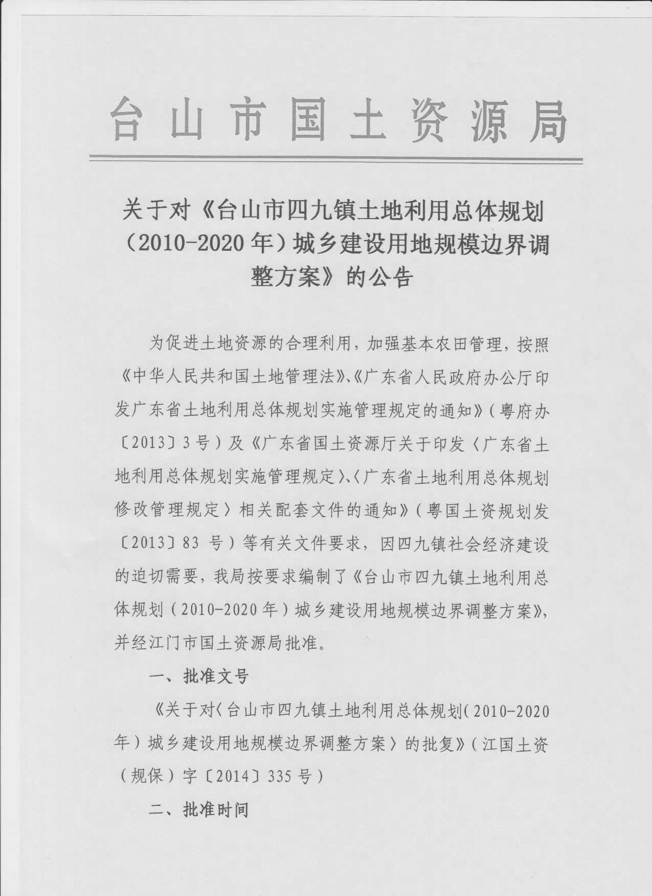 关于对《台山市四九镇土地利用总体规划(2010-2020年)城乡建设用地规模边界调整方案》的公告