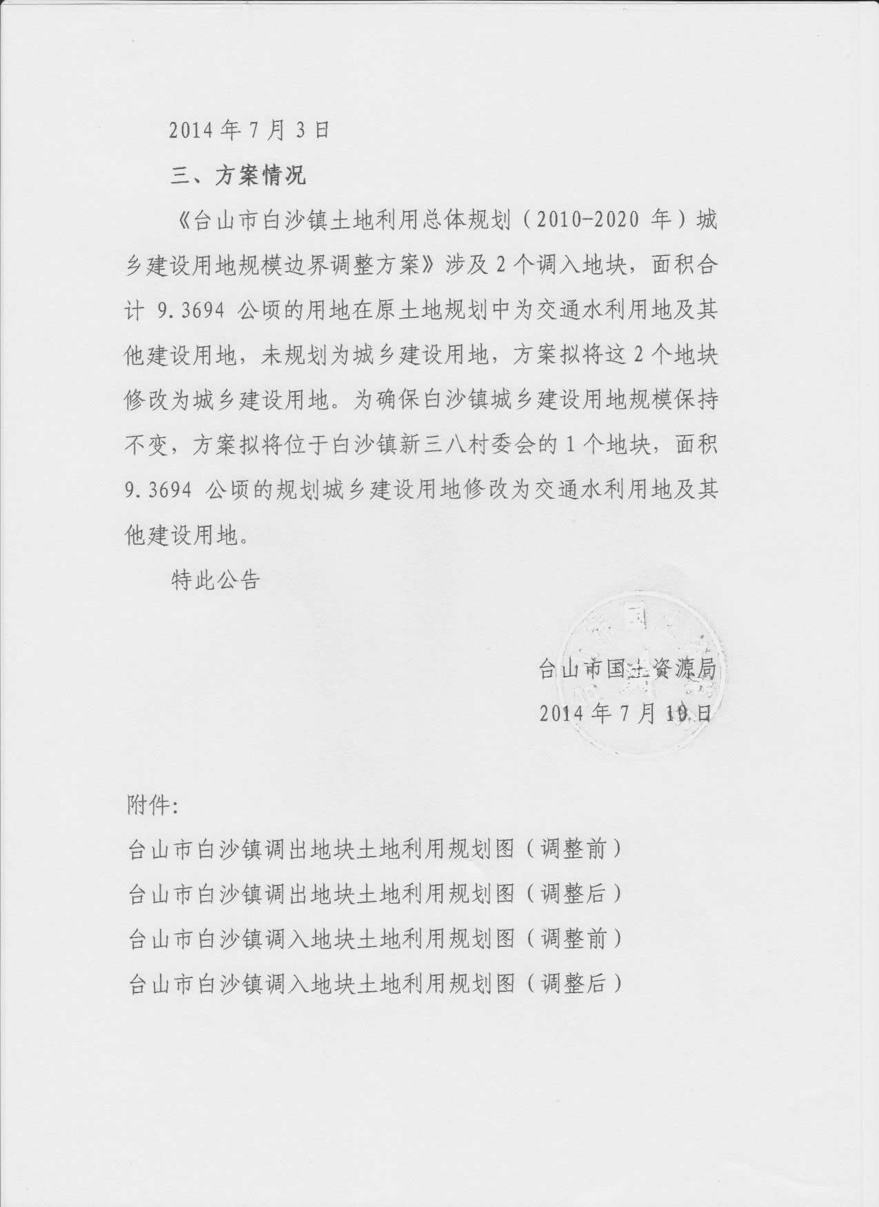 关于对《台山市白沙镇土地利用总体规(2010-2020年)城乡建设用地规模边界调整方案》的公告