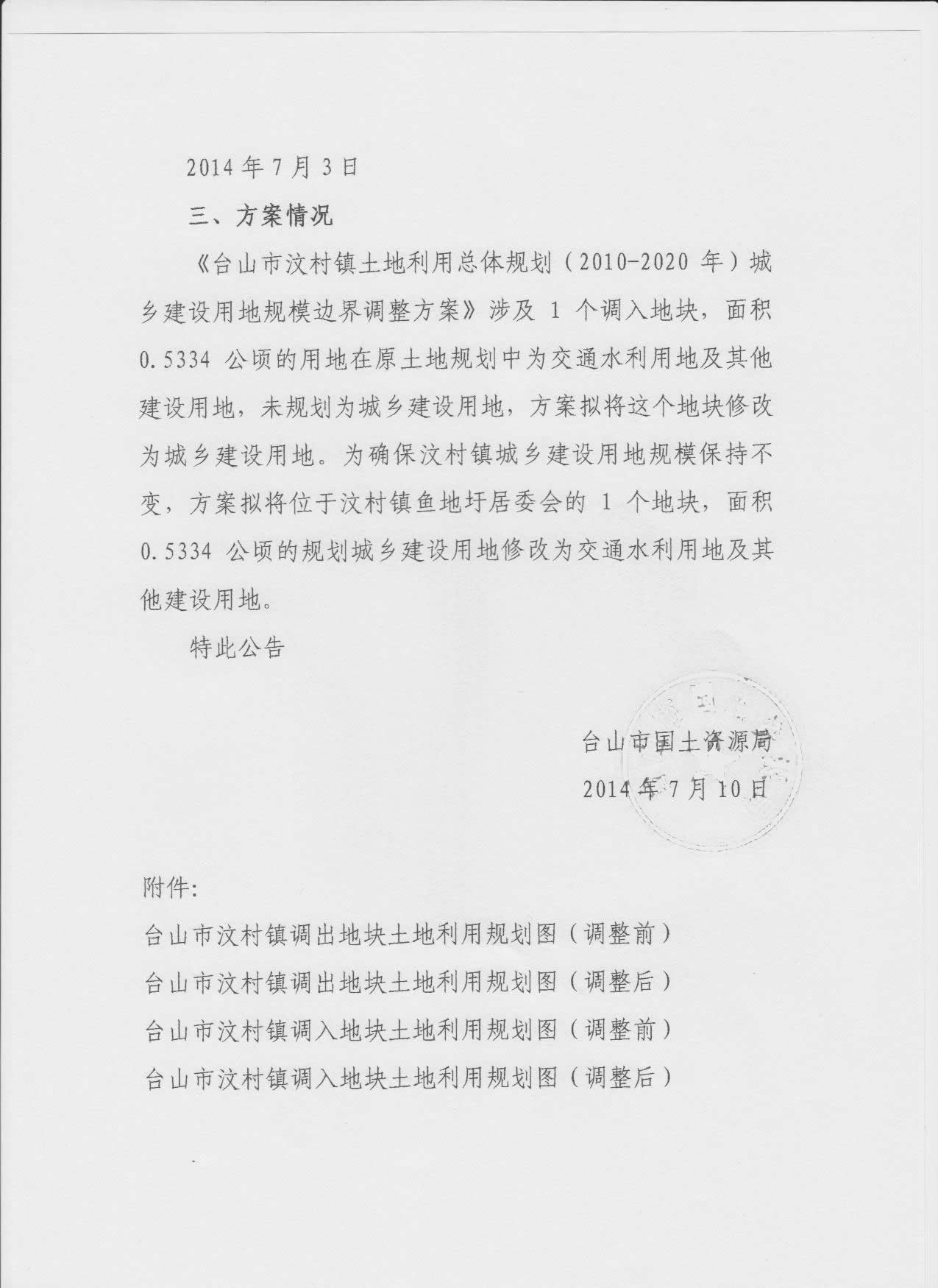 关于台山市汶村镇土地利用总体规(2010-2020年)城乡建设用地规模边界调整方案的公告