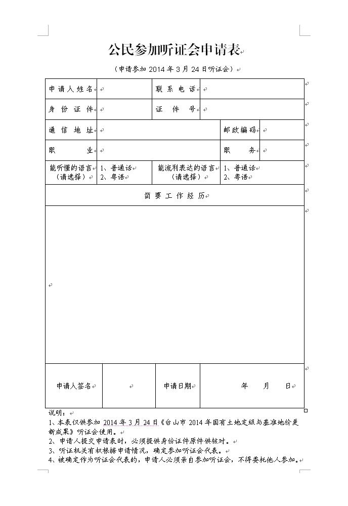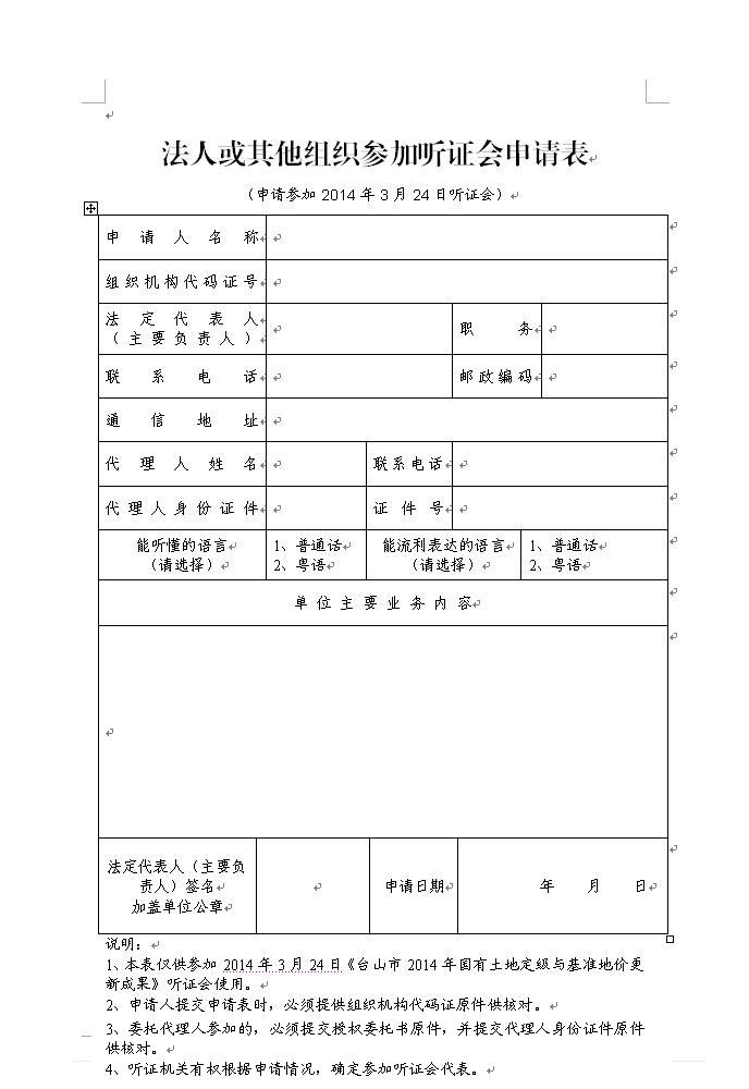 四、参加听证的单位或个人请将书面申请交到台山市国土资源局土地利用管理股(台城龙华里34号五楼)。属自然人的需提供身份证明复印件和相关资格证书复印件,属法人或其他组织的需提供机构证明或委托书。市国土资源局将根据该项工作的需要及申请人情况,确定参加听证会的代表,其中具有房地产、规划、建设等相关专业资格证书的申请人将列为优先考虑对象。