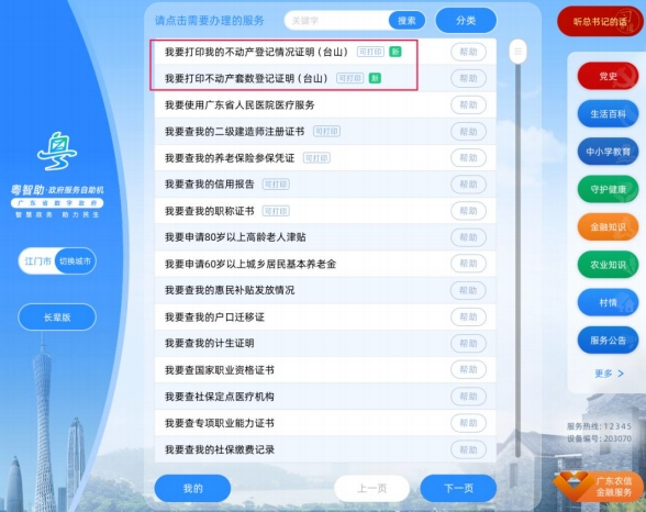 为进一步提升便民服务水平,优化营商环境,近日,台山市自然资源局与台山市政务服务数据管理局通力协作,新增两项不动产服务事项纳入“粤智助”政府服务自助机,可实现市民查询和打印台山市范围内的无房证明、单个不动产证明、个人及家庭成员名下不动产套数证明。