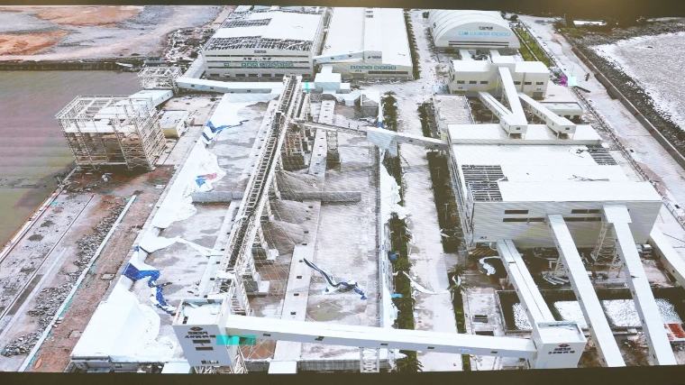 赤溪镇广海湾中电建绿色建材项目受超强台风吹袭。(上图:项目原貌 下图:灾后情况)