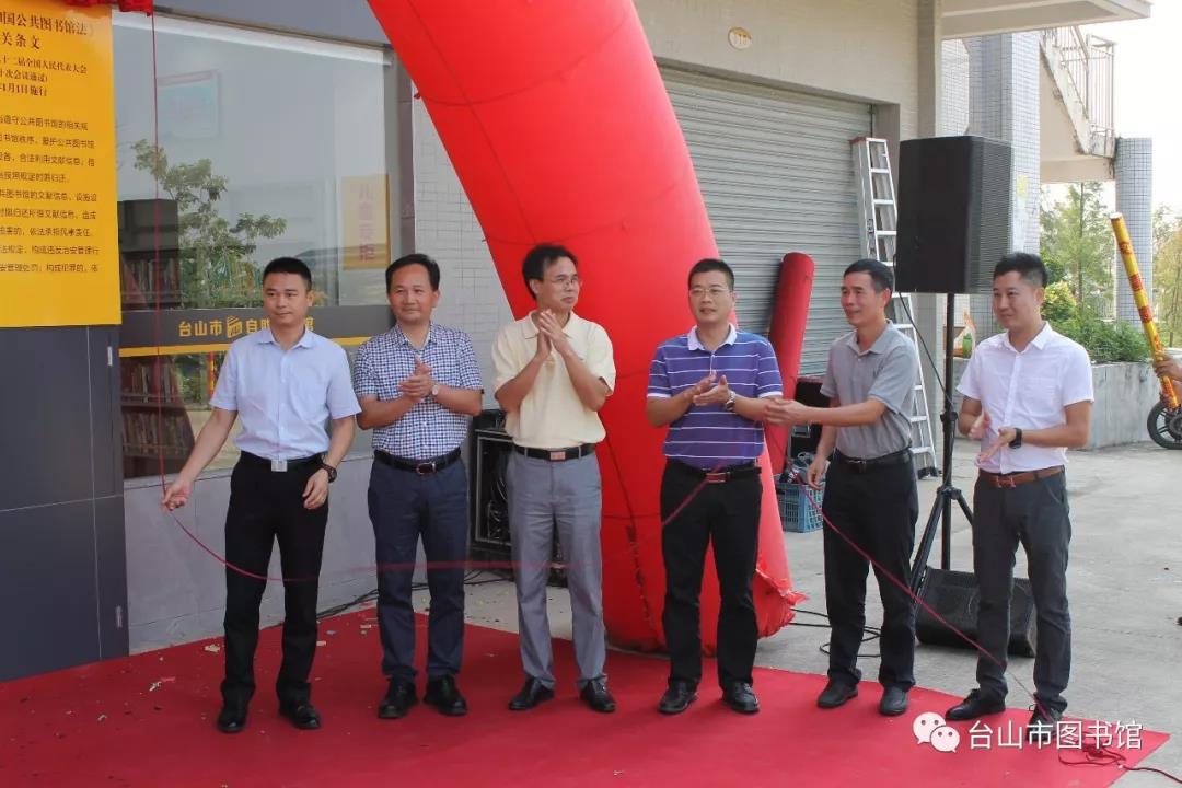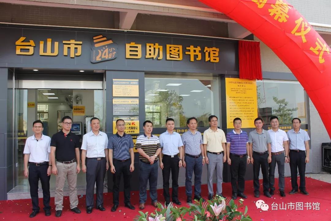 中共台山市委常委、宣传部长罗海华,江门市文广新局副局长柳超球及相关领导为台山市新建的24小时自助图书馆进行揭幕!
