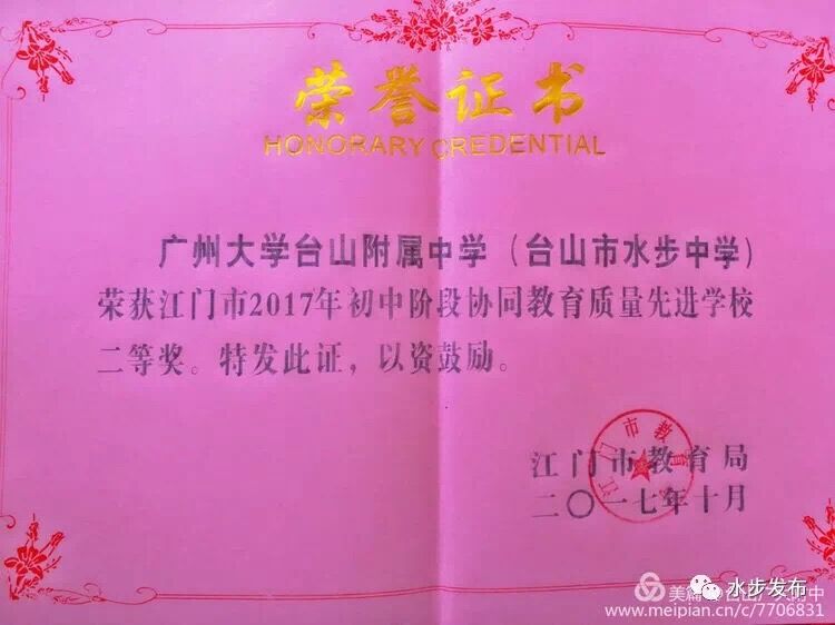 一直以来,在师生的共同努力下,学校教育教学质量不断攀升,名列台山市前列,先后荣获“国家级国防教育特色学校”“江门市一级学校”“江门市初中阶段协同教育质量进步奖”“江门市师德建设先进单位”“江门市初级中学教学水平优秀学校”等荣誉称号,赢得了社会的点赞和普遍认可。