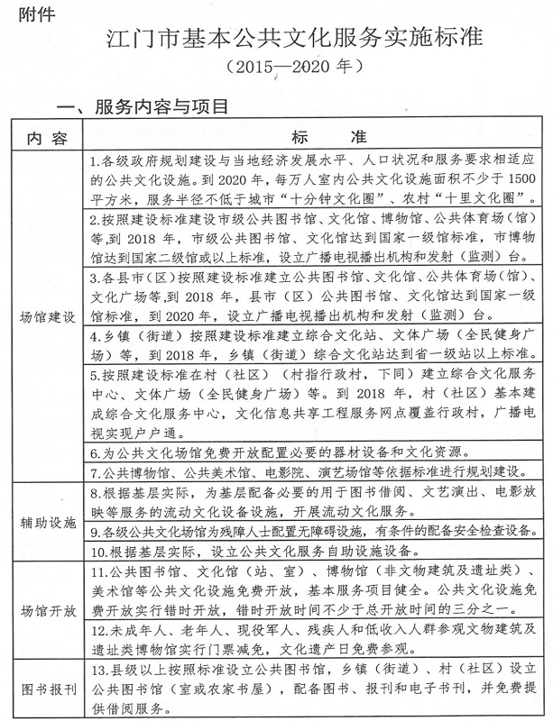 附件:江门市基本公共文化服务实施标准(2015-2020年)