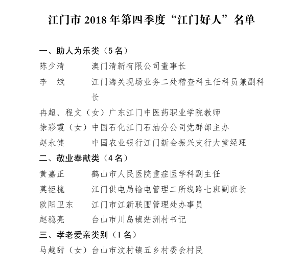 为深化“爱心之城”建设,培育和践行社会主义核心价值观,展示公民道德建设的丰硕成果,更广泛地动员广大群众支持和参与精神文明建设,江门市文明办组织开展了2018年第四季度“江门好人”推荐评选活动。经各地各部门推荐、网络投票、专家评审、网上公示以及资格审查,陈少清等10名同志被命名为2018年第四季度“江门好人”。具体名单如下: